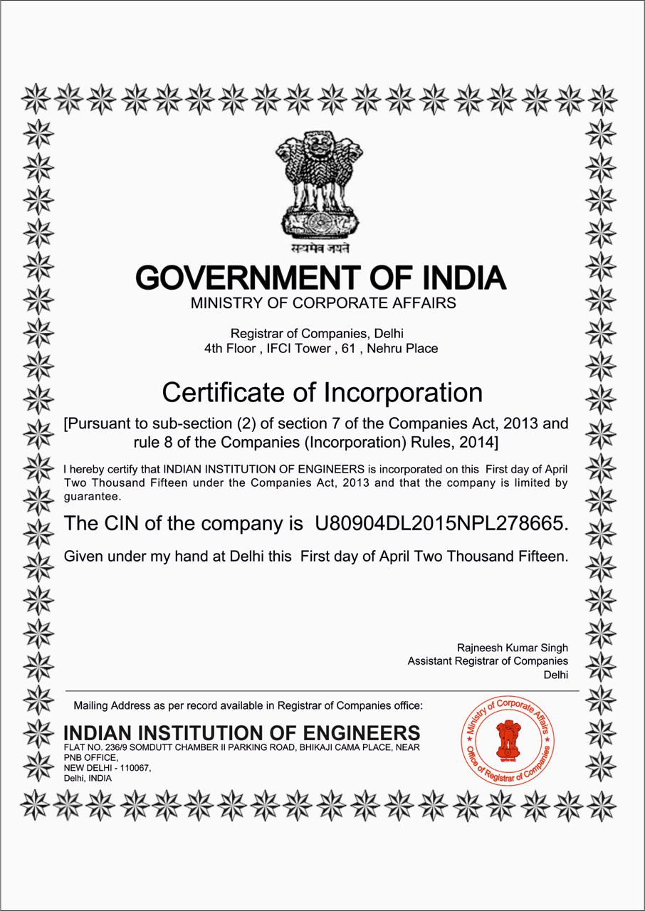 The Indian nstitution of Engineers (IIE), registered with the Ministry of Corporate Affairs (MCA), India, under a Memorandum of Association (MoA) and Articles of Association (AoA), functions as a legally recognized professional and corporate entity. This registration empowers IIE to operate formally as a society that promotes engineering education, research, and professional development. It offers recognized certifications and memberships, which are valid for employment and professional practice. The legal structure allows IIE to manage its finances, own property, conduct contracts, and govern its activities according to its AoA, including membership rules and internal administration. Additionally, IIE organizes seminars, workshops, and conferences, provides expert advice to government and industry, and fosters the advancement of engineering in India, all while maintaining accountability as a registered corporate body.